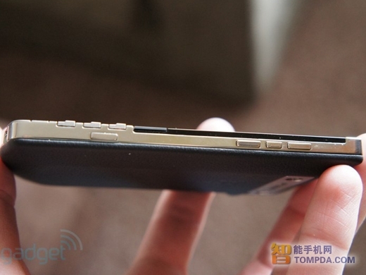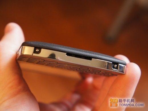 从手机侧面可以看到不锈钢材质机身与皮革材质后壳的相连接,两种完全不同的材质就这样被融合到了同一款手机中。
