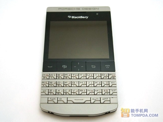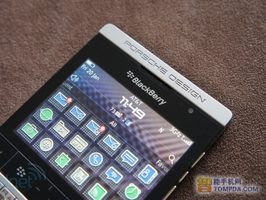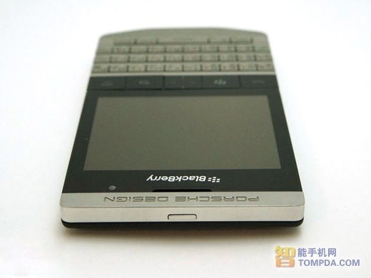 机身最上方是保时捷设计的表示,保时捷设计下方就是黑莓的Logo,与保时捷设计相比,黑莓的Logo非常低调。手机听筒也位于黑色玻璃面板之上,屏幕下方的功能按键区在开启背光灯时非常漂亮,除了四枚常用系统按键外,这款手机依然保留了方向触控板。