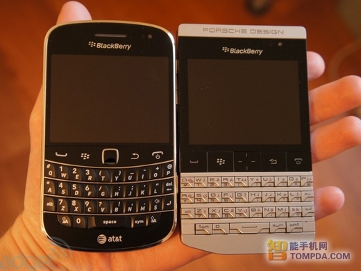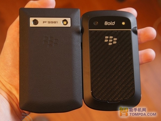 黑莓Bold 9900凭借强悍的配置以及不俗的外观,在黑莓手机中有着非常高的地位。但是与黑莓P9981放在一起,顿时觉得P9981霸气十足,这与金属材质机身以及外观设计风格有很大的关系。