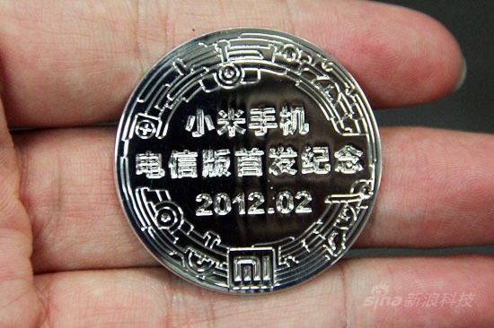 小米手机电信版首发纪念款徽章随机标配,正面印有“小米手机电信版首发纪念 2012.02”的字样,而背面的编号与手机后盖内测的印章编号相同,意味着这是仅发售千台的限量版机型。