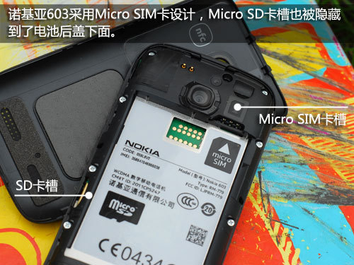 拆开后盖我们发现,Micro SD卡插槽被隐藏到了后盖左侧下方的位置,不太方便热插拔,但也起到了保护SD卡的作用。比较特别的是诺基亚603设计的是Micro SIM卡槽,而不是普通的SIM卡槽。对于使用普通SIM卡的用户而言,需要通过剪卡才能使用,好在目前移动、联通、电信都提供免费剪卡服务,所以用户大可不必担心剪卡问题。
