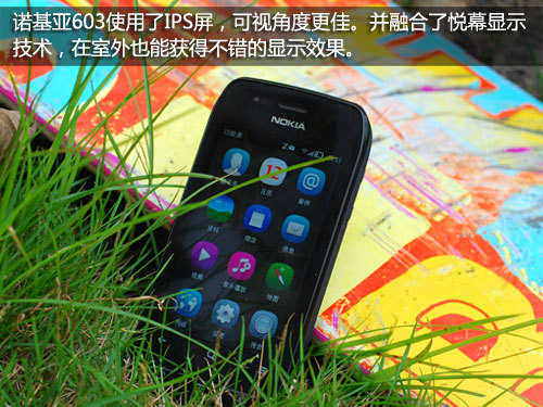 诺基亚603配备了可视角度更佳、色彩还原更好的IPS屏幕,并融合了自家的悦幕(Clear Black Display)显示技术,足以带来更炫丽多彩的显示效果。屏幕规格为3.5 英寸nHD(640x360)像素,像素虽不高,但也没有明显的颗粒感,足以满足日常应用,并且还能增强续航能力。