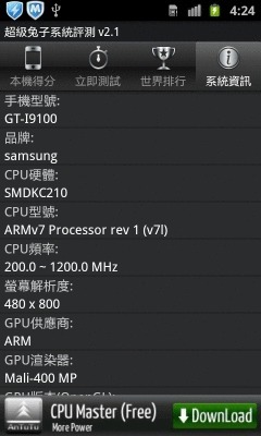 三星I9100移动处理器产品名称为“Orion”(猎户座),采用了三星的45nm低功耗制程技术,并采用了两个1.2GHz ARM Cortex A9核心,对多媒体性能、CPU处理速度、存储器带宽、续航时间等均进行了优化,将会为移动应用带来更好的体验。同时,集成Mali 400图形芯片,运行频率为300MHz,性能非常强劲。