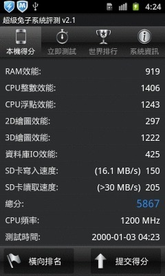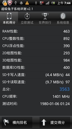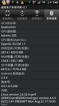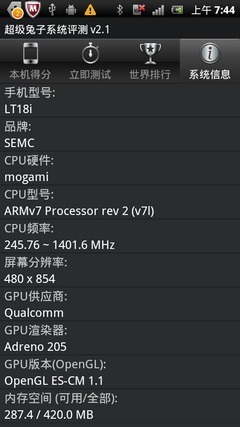 索尼爱立信LT18i在系统和硬件方面进行了升级,采用了最新的Android 2.3.4操作系统,处理器也升级为了1.4GHz主频的单核处理器,配合512MB RAM(运行内存)+1GB ROM,在系统性能方面表现出色,下面将对索尼爱立信LT18i进行常规的软件跑分测试,看看它的表现如何。