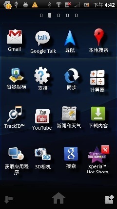 进入索尼爱立信LT18i的菜单,整体样式并不是Android手机常见的滚动式,而是每屏十六宫格样式的排列,并且图标都依托在一个透明的面板上,显让整个界面显得非常具有前卫科技感,在排列图标时,当数量达到上限时,系统会自动扩充一屏来放置更多的程序图标,屏与屏之间为横向的切换。