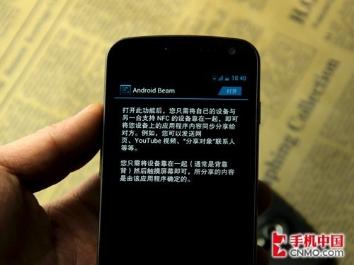 NFC的正确用法是把两款手机背对背相碰,当然,这两款手机必须都是Android 4.0。但是我们碰了之后发现手机没反应,这里需要提醒大家,碰的两台手机必须都在非锁屏状态下,否则两台手机就“不来电”。