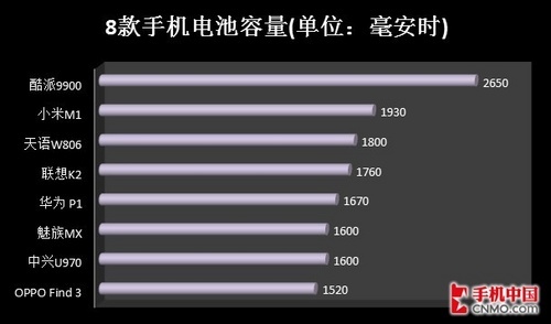 目前智能手机待机时间短的问题十分严重,所以我们也将这8款手机的电池容量一一列举出来。