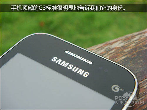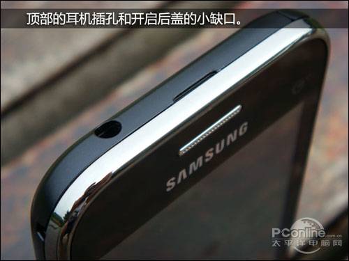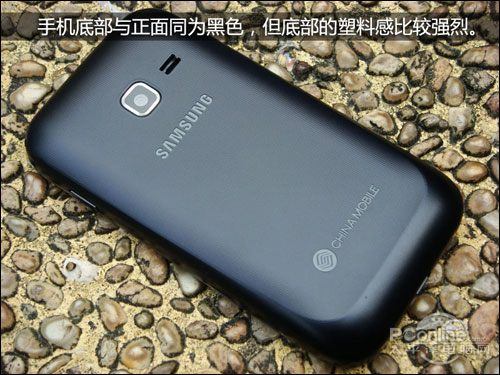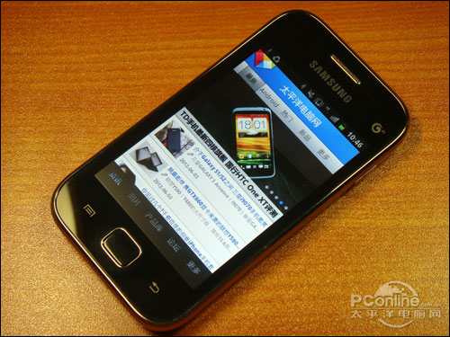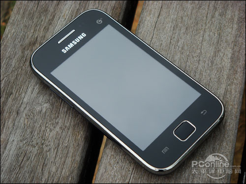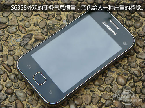 S6358的外观延续三星智能手机的风格,给人的感觉很圆润,像一部迷你版的I9000。机身正面的面板采用一体化设计,屏幕占了大部分的面积,但面板比较容易让人留下指纹,成为“指纹收集器”,当然贴个磨砂膜可以很轻松解决。另外,正面的银色边框让手机看上去很有质感,为手机增添了几分硬朗的气息。