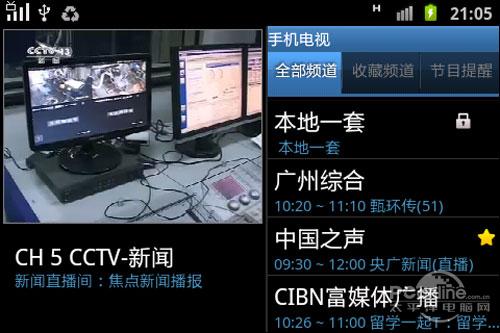 用户在广州地区有多个免费电视台可以收看,如CCTV新闻、广州综合、中国之声和CIBN富媒体广播,它们基本能满足一般用户的对资讯的需求,而且用户还可以在菜单中看见各电视台的节目预告。