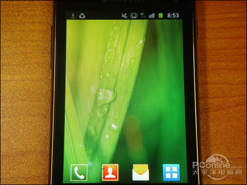 主界面给人的感觉小清新,四个图标从左到右分别为拨号键、联系人、短信和主菜单,用户可以在主屏添加多种三星为用户定制的小插件 ,主界面支持的主屏数量最多可达到8个,用户可根据自己的需要添加或删除。