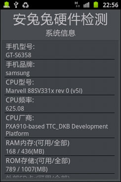 S6358的硬件配置比较均衡,配备800MHZ的CPU,RAM为512MB,ROM为1GB,相对于同级机来说没有什么落后之处,由于屏幕分辨率比较低,在配置不高的情况下手机的运行速度也不错。可能是由于笔者手中的S6358还未正式向消费者销售的原因,系统还不完善,手机暂时不支持用安兔兔跑分,下面让我们来通过其他几个测试软件了解S6358的硬件性能。