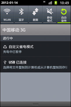 通知栏上集成了手机常用工具的小开关,在大部分的界面中,用户都可以随时激活它们,这样比把它们当插件直接放在主屏方便得多。
