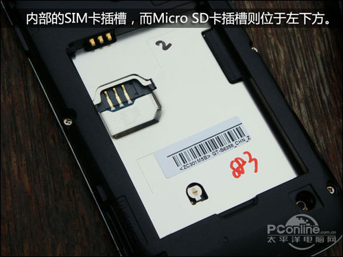 电池仓看上去很简洁,不像部分手机那样能直接看到电路板。由于手机还没有正式向消费者发售,机身内部没贴入网许可证。从上图可以看出,用户不用先取下电池就能装卸储存卡,这种设计还是比较人性化的,还有一点让人可喜的是手机最大支持32GB的Micro SD卡。