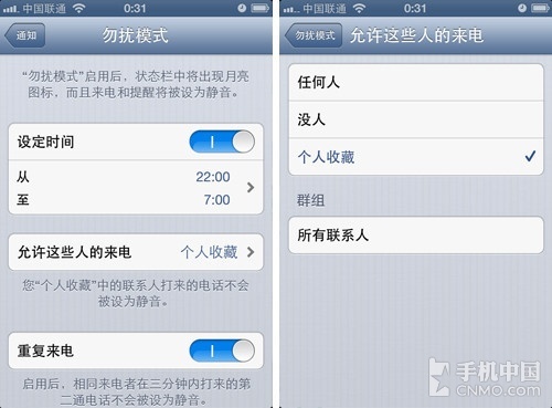 除此之外,iOS 6还具备了勿扰模式,可以设定勿扰模式的时间,在勿扰模式的时间段内,非允许用户是打不进来电话的,同时也不会出现通知信息。你可以把你通讯录中的联系人添加至允许名单,重要电话是不会漏掉的。