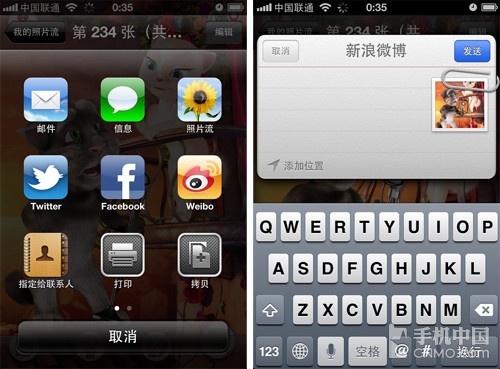 iOS 6 Beta中已经加入了不少中国特色服务,其中最吸引我们的还是微博账户的绑定,与Twitter和Facebook一样,本次新浪微博也将在iOS 6中扮演重要角色,你可以直接在媒体库中直接将信息分享至微博。