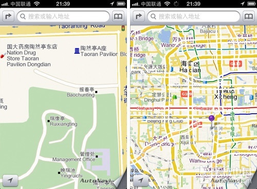 在iOS 6 Beta版中,中国地图使用的是高德的地图数据,对于我们这些吃过谷歌地图亏走过冤枉路的人来说,本土化的高德地图相比谷歌地图在中国地区更加受欢迎,同 时高德地图也有着更快的载入速度,这些可能苹果自家的地图也无法企及。基于这种本土化优势,我们猜测苹果在正式版iOS 6中也很有可能继续使用高德地图。