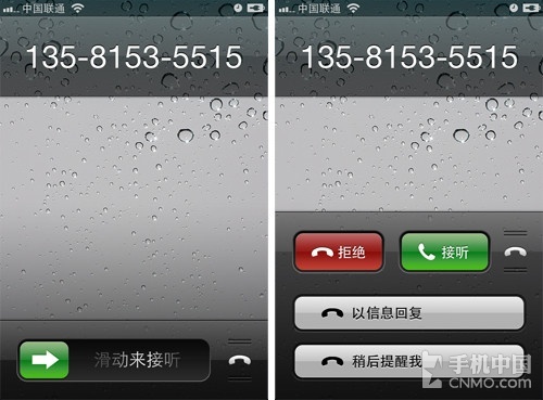 当有人来电时,如果你不想接听,就可以在屏幕右上角向上滑动,除了可以显示接听和挂断键外,还多出了回复信息和稍后提醒我选项,这个功能实用性非常强,虽然这个功能已经在其他手机中有了,但是在iPhone上还是头一次出现。