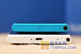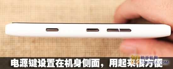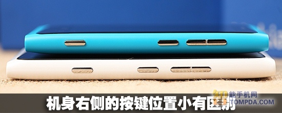 机身右侧设置了三颗按键,从左至右为快门键,电源按键以及音量按键,按键的手感很好。相比Lumia800,因为机身尺寸增大,Lumia900的电源按键位置有调整,更靠近中间,单手握持手机时大拇指可以轻松按到电源键。机身左侧没有任何元素。