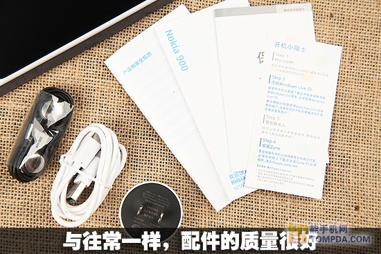 包装盒的空间都经过了合理的利用,而配件为充电插头,USB线,耳机以及纸质说明书,配件的质量也是非常不错的。值得注意的是Lumia900的配件中没有N9以及Lumia800附送的硅胶套。