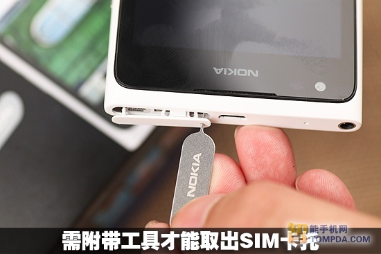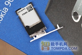 机 身顶部的设计相比N9,Lumia800,改动比较大,去掉了N9上的MicroUSB接口的防尘盖设计,这样在充电或传输数据时就方便了很多,还不用担 心防尘盖的使用寿命。Lumia900使用的是MicroSIM卡也就是俗称的小卡,不过与N9上的滑动取出SIM卡卡托不同,Lumia900需要随机 附带的顶针工具才能取出SIM卡卡托。3.5毫米耳机接口左侧小孔为用于降噪的第二麦克风。