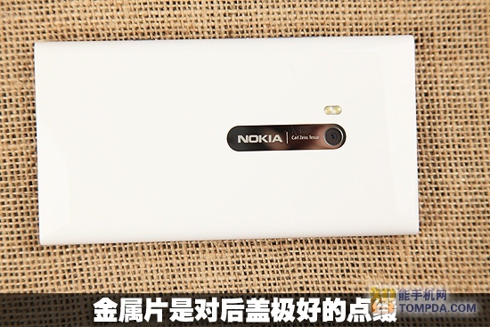机身背部设置了800万像素摄像头以及双LED补光灯。金属片很好的装饰了摄像头和后盖,金属片上印有诺基亚的英文LOGO以及卡尔蔡司认证的标示。