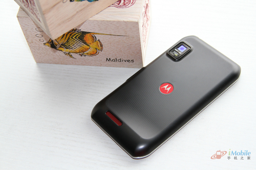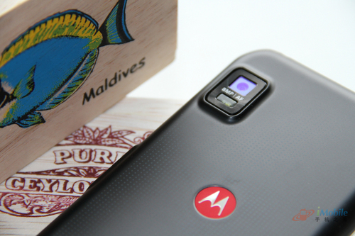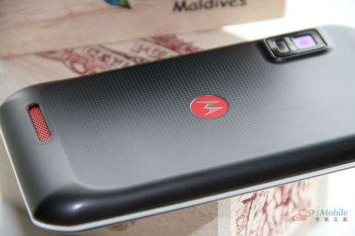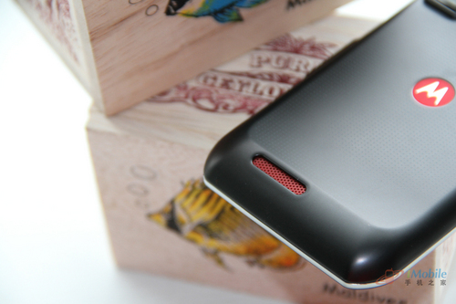 背面设计上有些另类,或许设计师是为了突出时代感与科技感。左上角800万像素摄像头一些“溜边儿”紧贴在后盖左侧边线之上,中心一颗红色摩托罗拉LOGO也帅气十足。底部略突出一块是宽大的扬声器,依旧用红色做了重点突出的装饰。