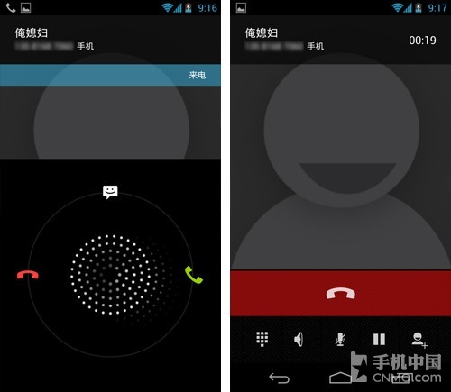 同时接听界面也采用了和解锁同样的风格也与屏幕解锁风格一致,对于这个“点阵”风格,只能看个人喜好了,反正我是觉得不如Android 4.0 ICS的简洁。