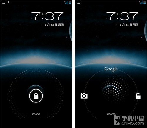 首先让我们感到不同的便是解锁界面,Android 4.1的解锁界面虽然还是环形,但是动画效果变了很多,这个改变虽不如原来简洁,但是华丽了许多,解锁界面加入了搜索的快捷方式,这个是原来没有的。