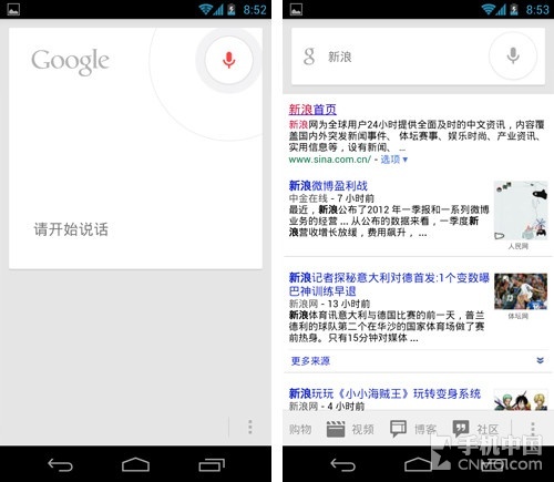 语音搜索也是本次发布会的一大亮点,全新的语音搜索有了更漂亮的界面,同时搜索结果也与用手输入一致,这个语音搜索的识别率相当高,看来谷歌搜索的老大并不白做。
