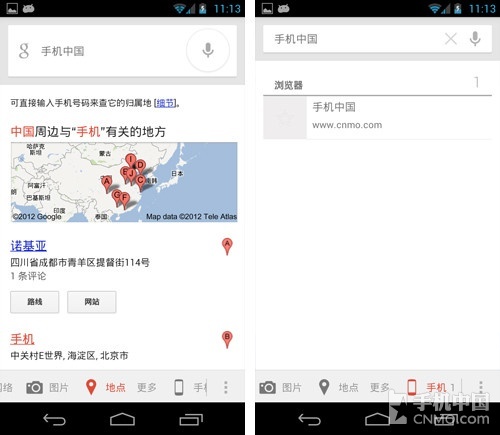 谷歌应用在Android 4.1 Jelly Bean上体现的更多,尤其是在取消搜索键后,用户可以长按Home键进行搜索,这个操作可以在任何情况下完成。确实对于喜欢用搜索的朋友来 说,Galaxy Nexus没有搜索键是很不方便的,而有了这个功能后,在任何界面都可以直接进入搜索。