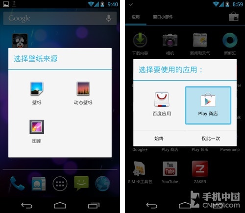桌面墙纸的的修改方式并没有改变,同样是按住屏幕,但是界面由以前的纯文字,变成了现在带图标的样式。类似的默认程序选择在Android 4.1下都有这样的改进。