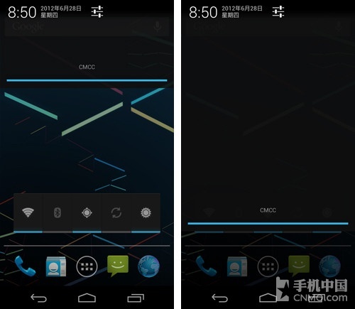 新的下拉通知栏有不少改变,首先是界面的样式以及按钮,有了更大的时钟,还可以显示时间与日期,颜色没有了灰色。