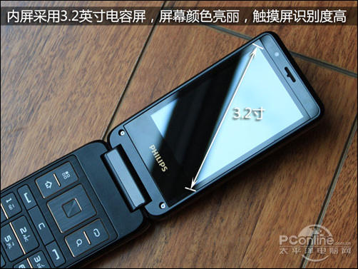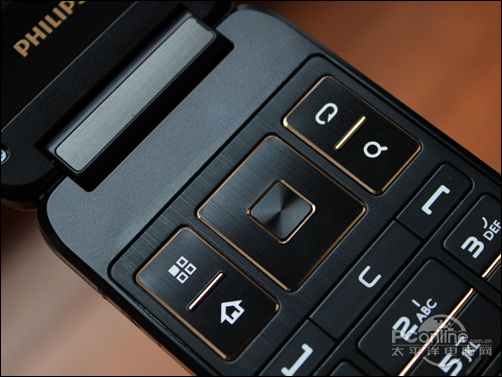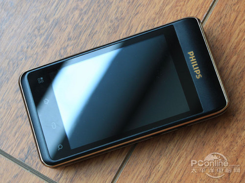 飞利浦W930的外屏尺寸为3.2英寸,镜面外屏和暗金色镶嵌相得益彰,而在屏幕的上方嵌有飞利浦的金黄色LOGO,屏幕下方是W930外屏的操作按钮,从左到右分别是功能键、主页键、返回键、搜索键。当手机合上时,使用外屏飞利浦W930也能像直板触屏机般进行单手操作。