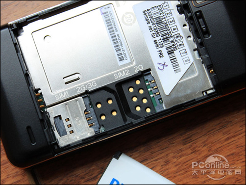 取下手机电池,我们可以看到在电池仓的一侧分布着手机的双SIM卡槽,左右两个卡槽的旁边标有2G/3G的标识,提示用户SIM的正确摆放位置。