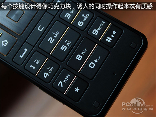 中间部分的是手机的拨号操作区,通过三个键可以实现快速拨号等操作,而下部分是手机的按键区域,采用经典的九宫格设计,每个按键键程宽大,印有字母和笔画等标识,操作方便手感舒适,另外在键盘底部设置有两个小正方形软块,有保护屏幕的作用。