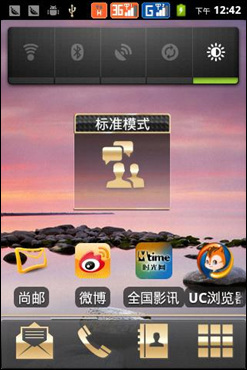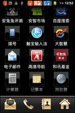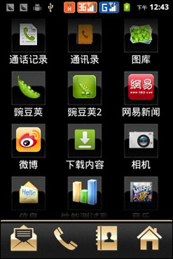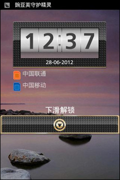 飞利浦W930不仅外观尊贵时尚,在功能上也有其过人之处。手机搭载了Android 2.3.6操作系统,界面整体看起来简洁有序,且经过二次开发后,和原生的操作桌面相比,飞利浦桌面更为耐看,连桌面系统图标都采用金色设计,商务气息一览无遗。飞利浦W930的解锁界面采用向下滑动的方式解锁,界面设计简单,清晰显示了营运商、时间日期和电池容量等重要的常用信息。