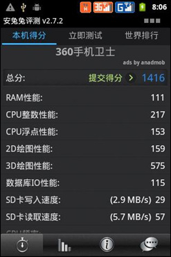 从antutu和QuadrantAdvanced的跑分结果看来,飞利浦W930的表现只能算是一般。多点触控方面,仅支持最多3点触控,在FPS测试中,飞利浦W930的表现令人惊讶得分为82.3fps,图形处理能力非常突出。