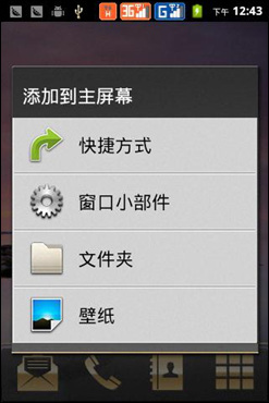 通过长按屏幕空白处便可以进入添加插件的界面,对于使用过Android系统的用户来说,上手还是非常快的。在程序界面,长按某些应用程序图标,也可以将其快捷方式添加至各个主屏,用户完全可以按照自己的需要去定制每一个主屏,个性化程度高。