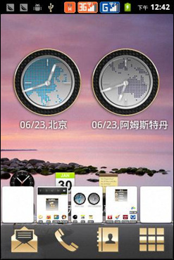 进入操作主界面,屏幕底部设置有四个固定的功能键,从左到右分别是信息、拨号、通信录和主菜单,长按主菜单键能调出屏幕的缩略图,飞利浦W930一共拥有5个主屏,每一个主屏都可以存放自己喜欢的快捷键或程序图标。