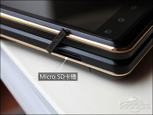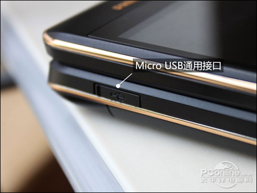 机身左侧的Micro USB插口用于手机充电和数据传输,下方则设置有MicroSD卡扩展槽,最大可支持32GB容量的MicroSD卡,支持海量储存。插口和卡槽外部使用卡扣遮蔽,可以防止灰尘入侵。