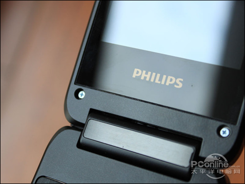 在屏幕下方同样印有一个醒目的飞利浦标志,另外我们从图片可以清晰看见屏幕下方有两个螺丝孔,飞利浦W930并没有用软胶进行掩盖,难道是飞利浦刻意而为?凸显手机豪气的一面?机身连接上盖和下盖的转轴设计得相当厚实,在转轴中间位置嵌有一小块金属板,目测旁边还有个小扣,估计是拆机专用的。