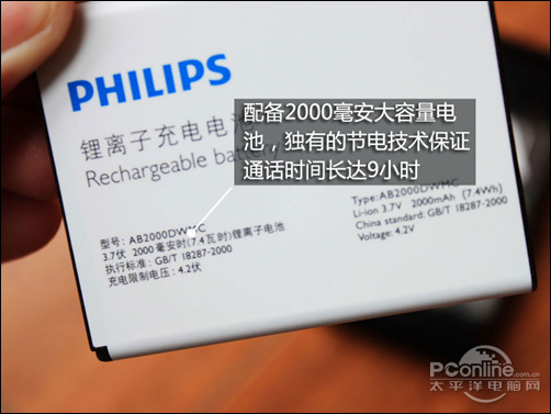 飞利浦W930配备了2000毫安可充电式锂离子电池,采用飞利浦独特的节电技术,满电状态下可连续通话9个小时。整个测试下来,笔者打电话20分钟,3G上网15分钟,短信15条,多媒体播放10分钟,硬件测试20分钟经统计电量耗去12%,节电能力可见一斑,正常使用强度下估计能续航两天左右。