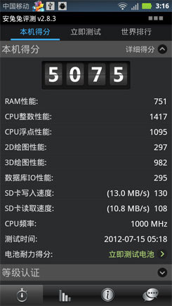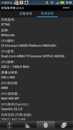 XT760在这两个环节的跑分不算很高,但其CPU的运算能力还是能够胜任一般的日常应用的。