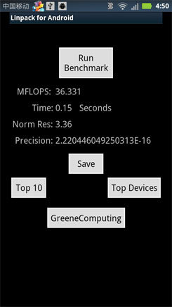 Linpack测试(36.331MFLOPS)和象限高级版跑分(2127分)