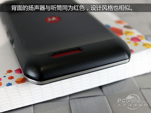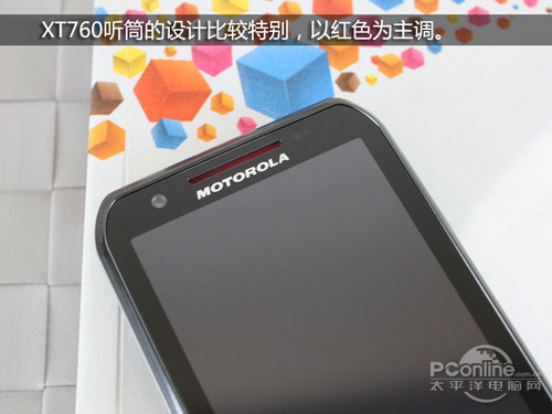 在扬声器这里我们依然可以看见在XT760机身上熟悉的红色,而且我们可以看见扬声器的表面积比较大,这样能更有利于声音的扩散,使用户不容易漏电话。