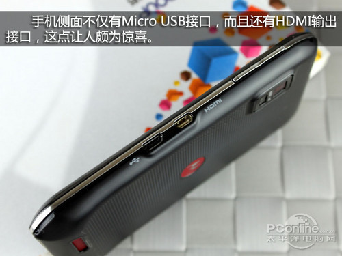 HDMI接口在这个级别的机型来讲不常见,摩托罗拉给XT760配备了这个接口让人欣慰,这对于影音发烧友来讲是一个非常好的消息,用户可以通过它用带有HDMI输入端的电视机欣赏手机内的高清影像,这样XT760就可以成为你的随身“高清播放机”了。