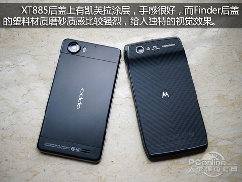 Finder后盖上面的塑料材质比一般的塑料手感要好,在强光的照射下,轻微反光的后盖显得十分漂亮。XT885上面的凯芙拉涂层早已经在前辈XT910推出的时候出了名,这种涂层的硬度很高,比Finder上面的材质耐用,XT885后盖上的图案让手机看上去更为高档,不过这相对于Finder的后盖来讲也更为张扬一些。