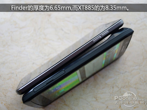 以较低的角度去看手机,大家会会感觉到超薄手机独特的魅力,Finder外观相对与XT885来讲要更加圆润一点,所以效果会更加明显。
