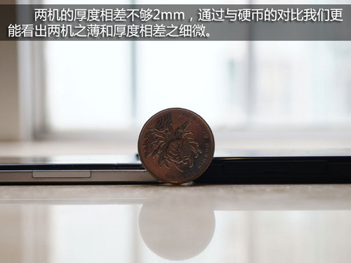 两机的厚度不及一个一元硬币的半径,两机的重量均为125g,拿在手上的感觉比较轻盈,但两机的机身都是比较宽的,弥补了超薄手机带来的握感不足这个缺陷。