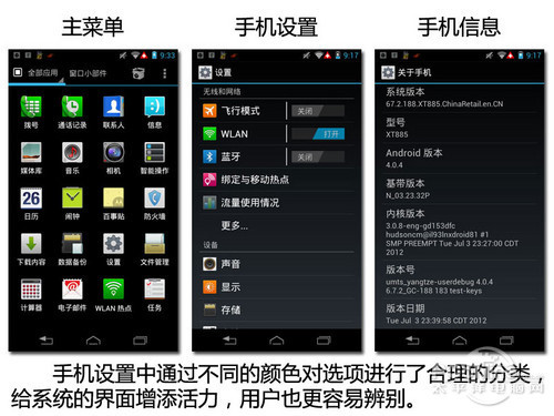Finder对原生系统中的设置菜单进行了较大程度上的更改,合理地分为四个页面,这些更改的实用性很好,使系统中繁复的设置选项有了规范的分类,用户可以更高效地管理自己的手机。XT885系统的设置菜单与原生系统较为相似,但多种颜色的配合还是有一定创意的。